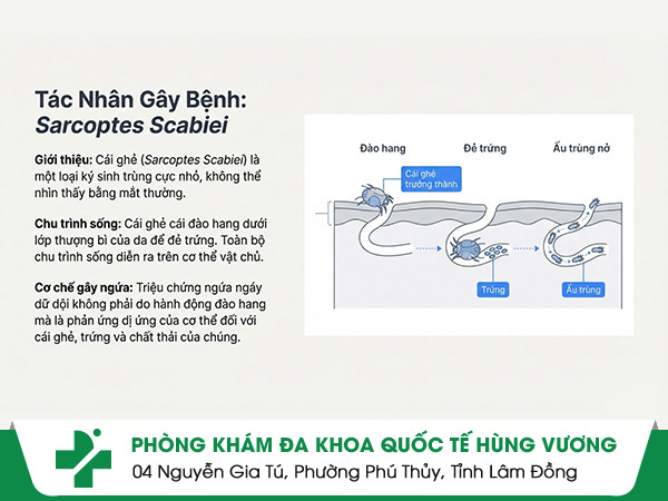 Ghẻ ngứa xảy ra khi ký sinh trùng Sarcoptes Scabiei xâm nhập vào lớp biểu bì, đào hang dưới da để đẻ trứng. Chúng hoạt động mạnh vào ban đêm khiến người bệnh ngứa dữ dội, mất ngủ, mệt mỏi. Da thường nổi chấm đỏ, mụn nước, dễ trầy xước – viêm nhiễm nếu gãi nhiều.