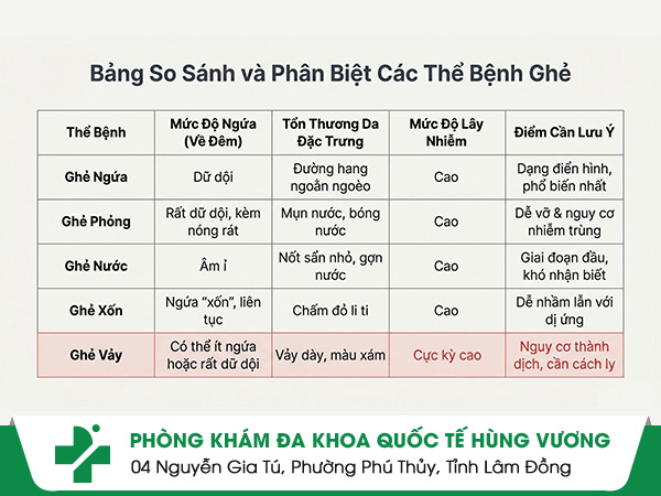 Loại ghẻ mắc phải: Ghẻ ngứa, ghẻ phỏng, ghẻ vảy... có mức độ nguy cơ khác nhau, yêu cầu phác đồ điều trị riêng biệt.