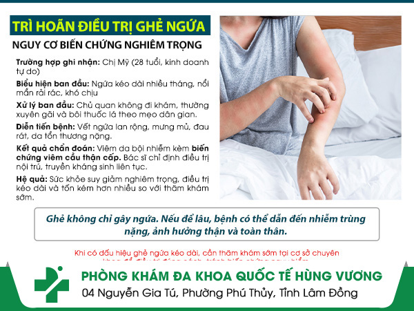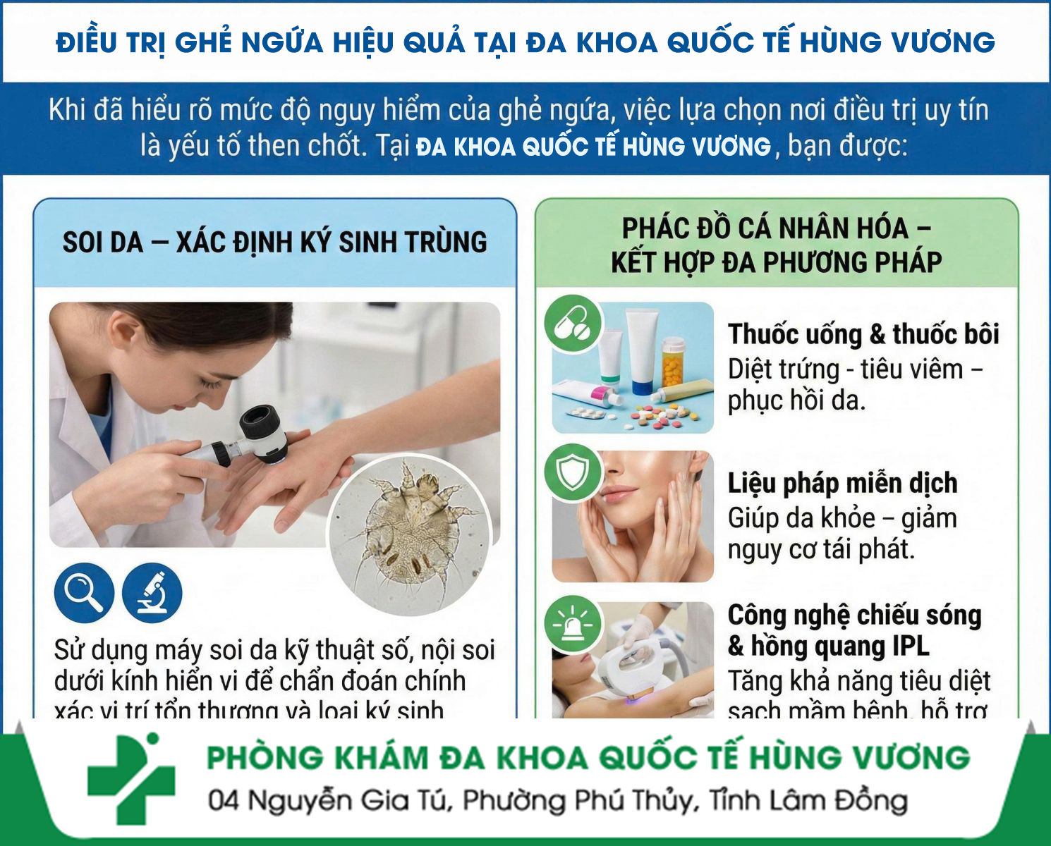 Không phải cơ sở nào cũng đủ năng lực điều trị khỏi hẳn bệnh ghẻ. Với đội ngũ bác sĩ giỏi và công nghệ hiện đại, Phòng Khám Da Liễu Hùng Vương (4 Nguyễn Gia Tú, P. Phú Thuỷ, Tỉnh Lâm Đồng) là địa chỉ uy tín được nhiều bệnh nhân tin tưởng lựa chọn.