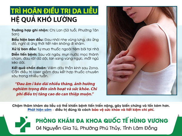 Phòng Khám Da Liễu Hùng Vương (4 Nguyễn Gia Tú, P. Phú Thuỷ, Tỉnh Lâm Đồng) là địa chỉ uy tín trong điều trị các bệnh ngoài da, đặc biệt là Zona thần kinh – căn bệnh dễ biến chứng nếu không chữa kịp thời. Được chuyên gia đánh giá cao, phòng khám chinh phục người bệnh bằng số liệu chữa khỏi bệnh đạt tỷ lệ trên 98%, có liệu pháp miễn dịch – laser kết hợp Đông Tây y và chi phí hợp lý.