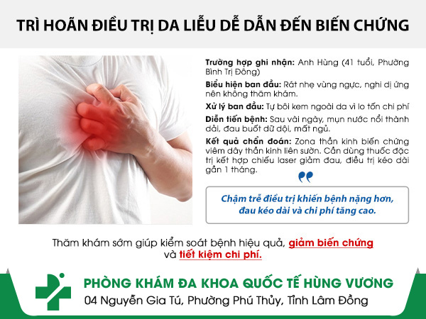 Zona thần kinh nếu được phát hiện và điều trị sớm sẽ giúp giảm đau nhanh, hạn chế biến chứng nguy hiểm. Đừng chủ quan với những dấu hiệu ban đầu. Nếu còn băn khoăn về tình trạng của mình, hãy liên hệ Phòng Khám Da Liễu Hùng Vương qua Hotline 0252 7303 888 hoặc NHẤN VÀO KHUNG TƯ VẤN để được bác sĩ da liễu hỗ trợ kịp thời, đúng hướng.