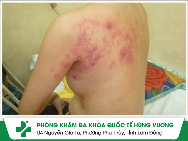 Phát ban – mụn nước: Nổi thành dải, chứa dịch, dễ loét và để lại sẹo.